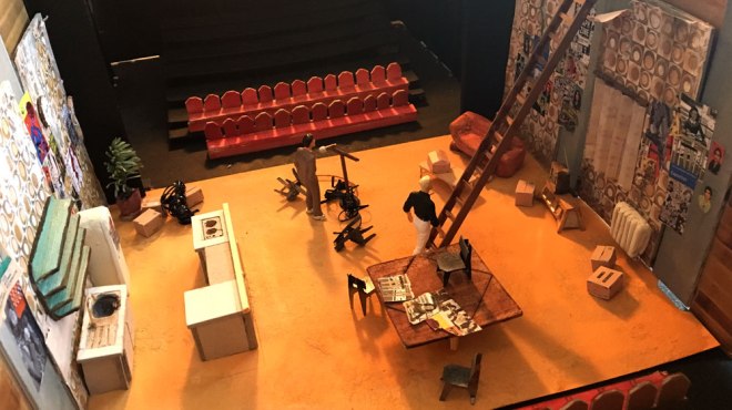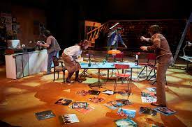 La reconstitution théâtrale du studio de diffusion rend compte de l’esprit de l’époque : les animateurs évoluent dans une joyeuse pagaille dans une atmosphère enfumée où l’agitation, qui ne respecte aucune division des tâches, offre un magnifique terrain de jeu aux comédiens du Français.